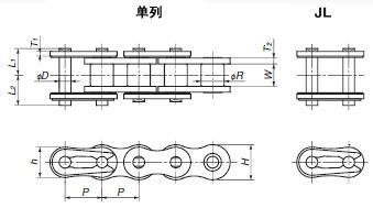 1.内链节的厚度比RS滚子链更厚,插入毡贴纸,销轴延长其尺寸(L1,L2)。请确认与装置的配置如何。