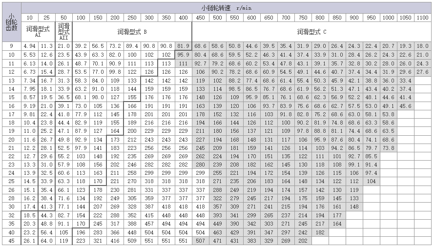 | 标注:1.在使用1节距过渡链条(OL)后,传动能力为上表的80%。使用2节距过渡链条(2POL),按照上表可直接使用。 |