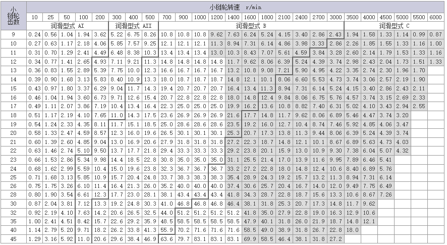 | 标注:1.在使用1节距过渡链条(OL)后,传动能力为上表的80%。使用2节距过渡链条(2POL),按照上表可直接使用。 |