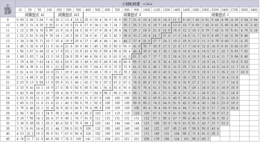 | 标注:1.在使用1节距过渡链条(OL)后,传动能力为上表的80%。 |