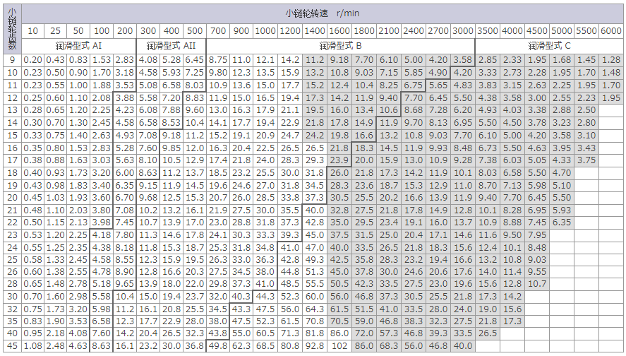 | 标注:1.使用过渡链节(OL)时,传动能力为上表的80%。 |
