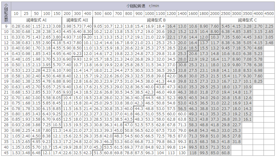 | 标注:1.使用过渡链节(OL)时,传动能力为上表的80%。 |