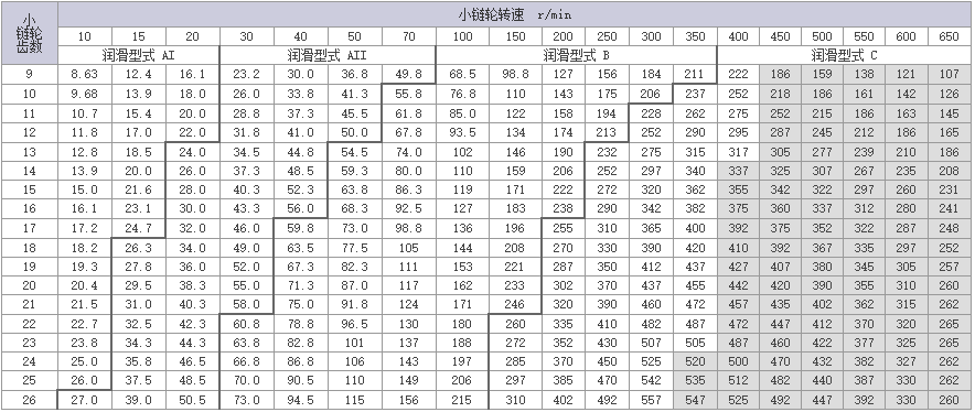 | 标注:1.使用过渡链节(OL)时,传动能力为上表的80%。 |